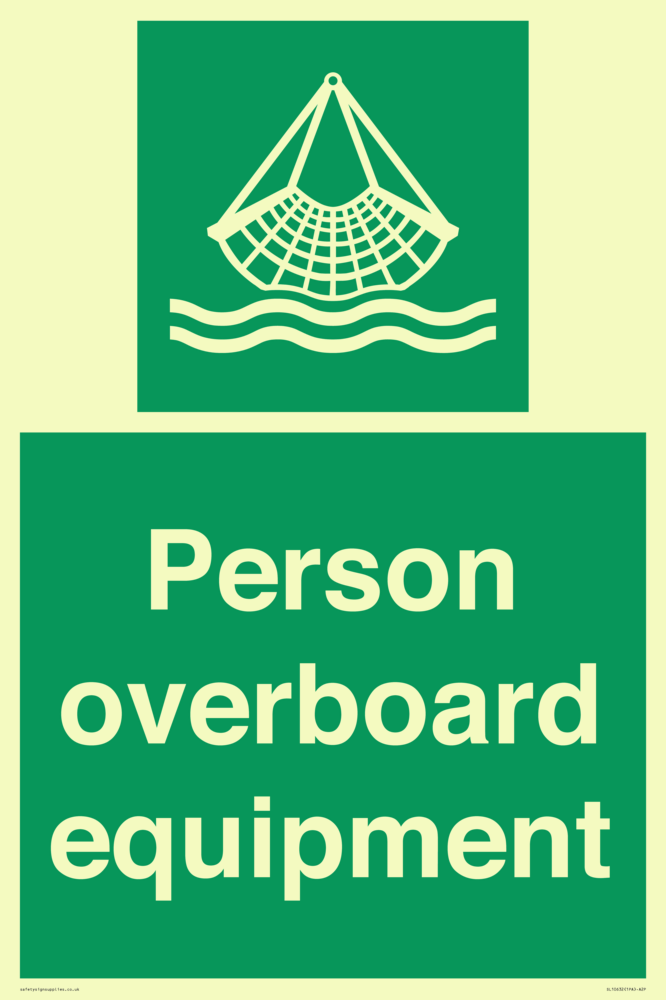 E928 Safe condition: Person overboard equipment symbol. To indicate the location of person overboard / man overboard equipment. Commonly known as a Jasons Cradle.