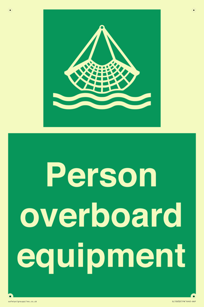 E928 Safe condition: Person overboard equipment symbol. To indicate the location of person overboard / man overboard equipment. Commonly known as a Jasons Cradle.