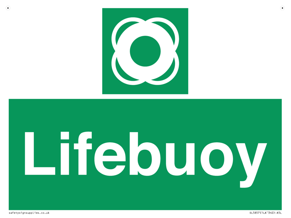 Sign Text: Lifebuoy Dimensions: 200x150mm Material: Aluminium composite 3mm with lamination Orientation: Landscape Text Colour: White Background Colour: Green More...