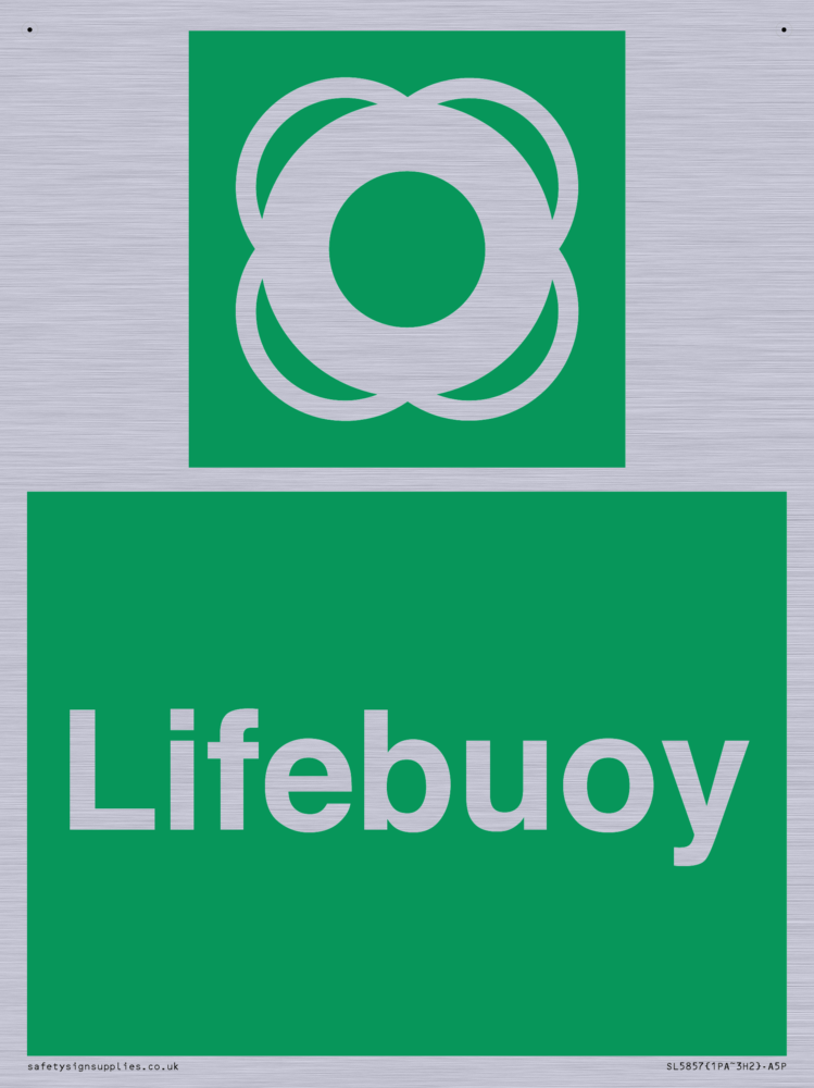 Sign Text: Lifebuoy Dimensions: 150x200mm Material: Grained Silver Aluminium Orientation: Portrait Text Colour: White Background Colour: Green More...