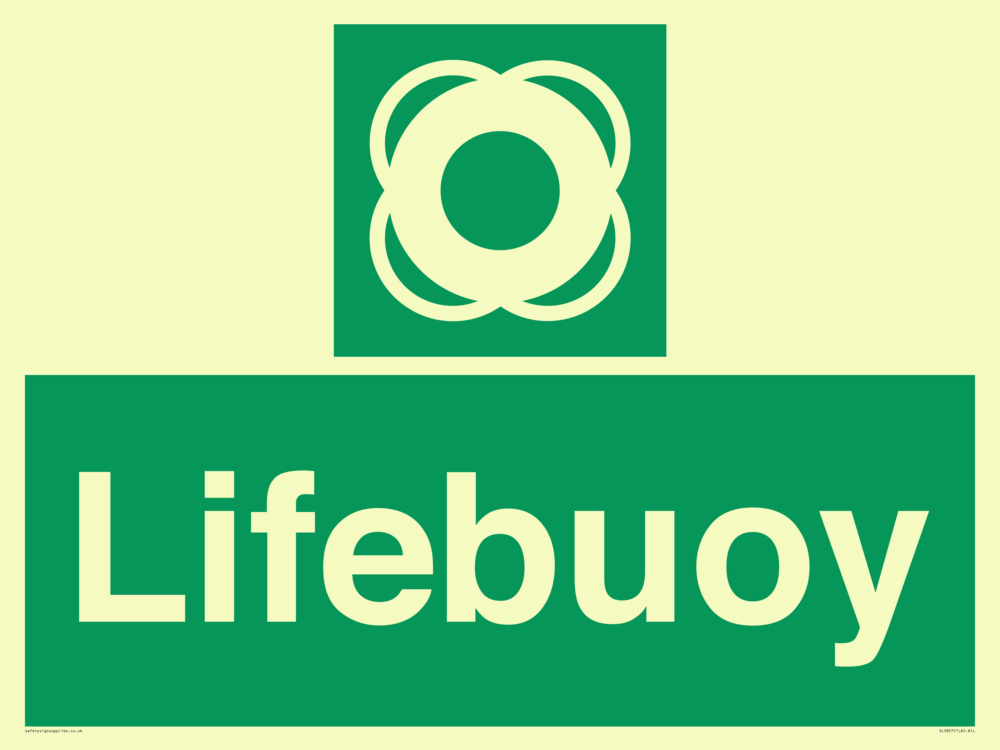 Sign Text: Lifebuoy Dimensions: 800x600mm Material: Plastic Semi-rigid Photoluminescent Orientation: Landscape Text Colour: White Background Colour: Green More...