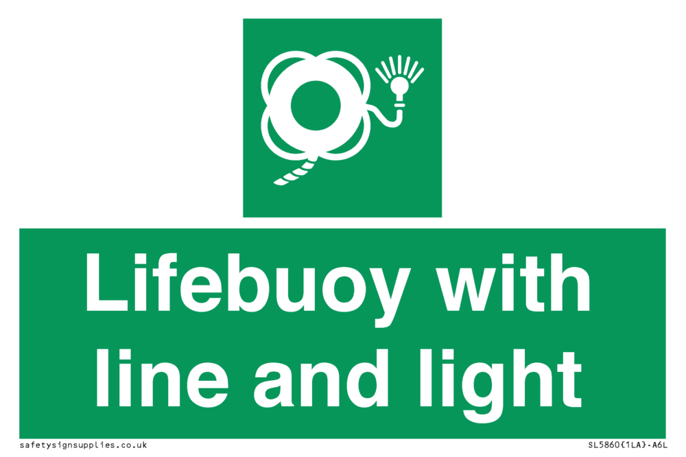Sign Text: Lifebuoy with line and light Dimensions: 150x100mm Material: Vinyl High Tack Orientation: Landscape Text Colour: White Background Colour: Green More...