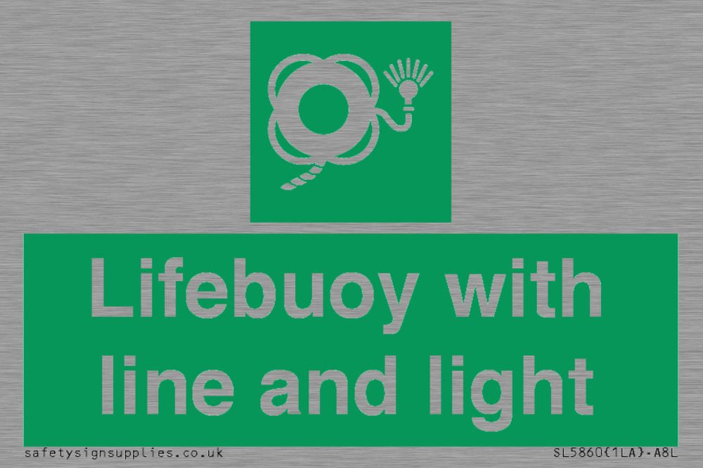 Sign Text: Lifebuoy with line and light Dimensions: 75x50mm Material: Stainless Steel Orientation: Landscape Text Colour: White Background Colour: Green More...