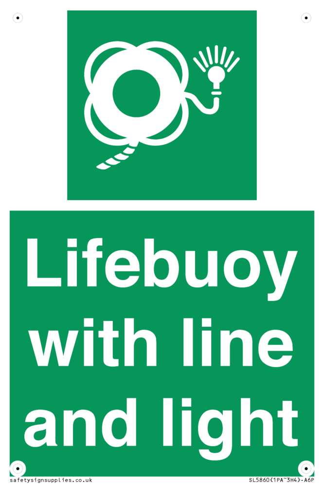 Sign Text: Lifebuoy with line and light Dimensions: 100x150mm Material: Plastic Rigid 3mm Orientation: Portrait Text Colour: White Background Colour: Green More...