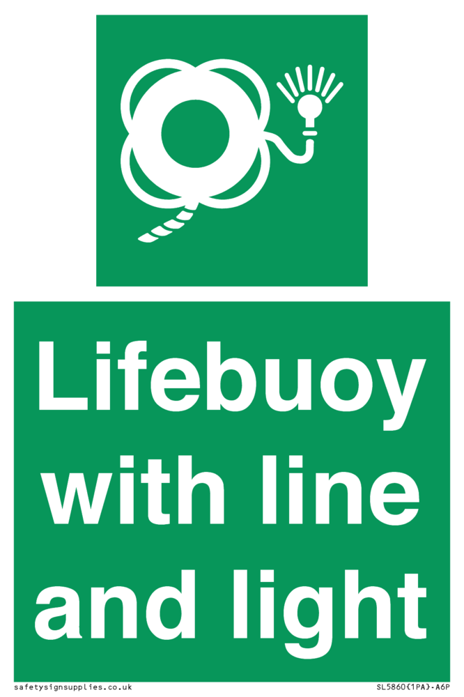 Sign Text: Lifebuoy with line and light Dimensions: 100x150mm Material: Vinyl High Tack Orientation: Portrait Text Colour: White Background Colour: Green More...