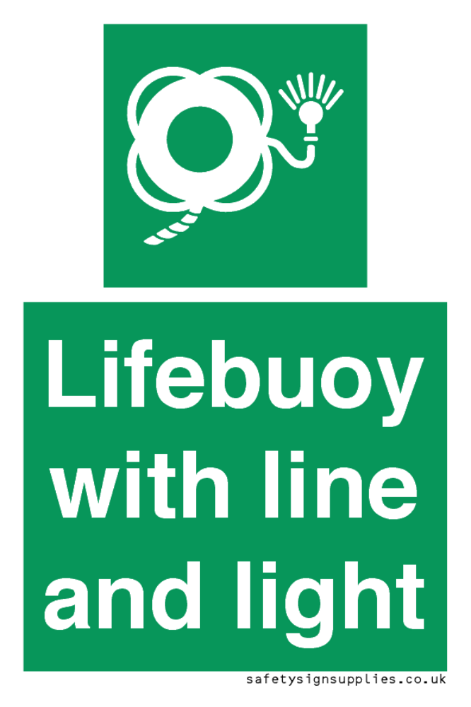 Sign Text: Lifebuoy with line and light Dimensions: 50x75mm Material: Plastic Semi-rigid 1mm Orientation: Portrait Text Colour: White Background Colour: Green More...