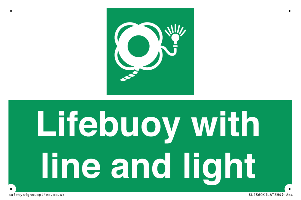Sign Text: Lifebuoy with line and light Dimensions: 150x100mm Material: Plastic semi rigid 1mm self adhesive Orientation: Landscape Text Colour: White Background Colour: Green More...