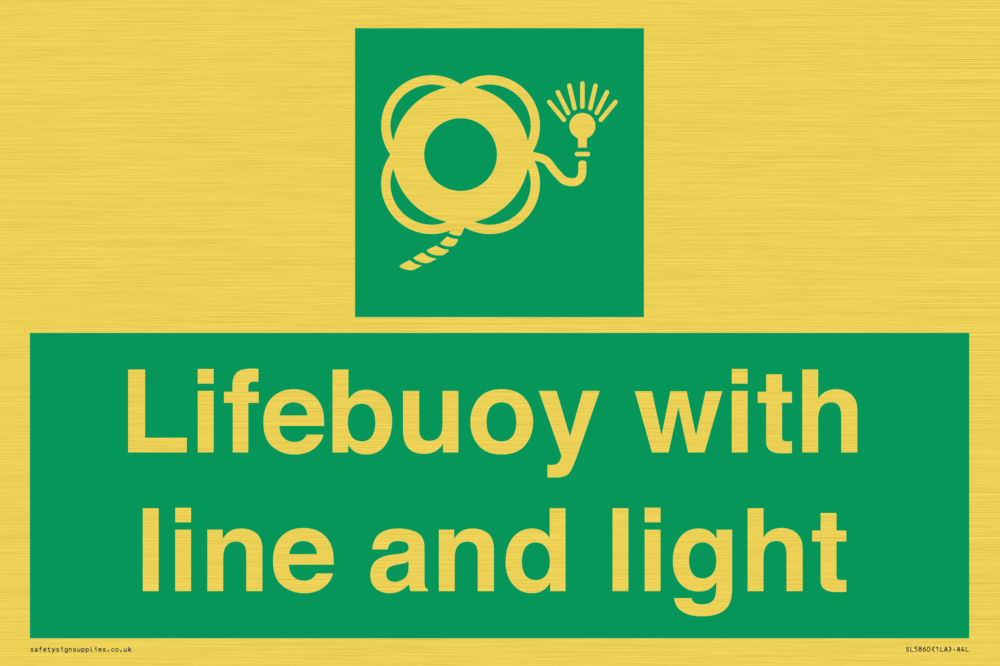 Sign Text: Lifebuoy with line and light Dimensions: 300x200mm Material: Plastic Semi-rigid Gold Orientation: Landscape Text Colour: White Background Colour: Green More...