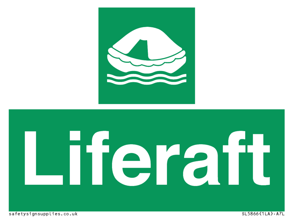 Sign Text: Liferaft Dimensions: 100x75mm Material: Vinyl High Tack Orientation: Landscape Text Colour: White Background Colour: Green More...