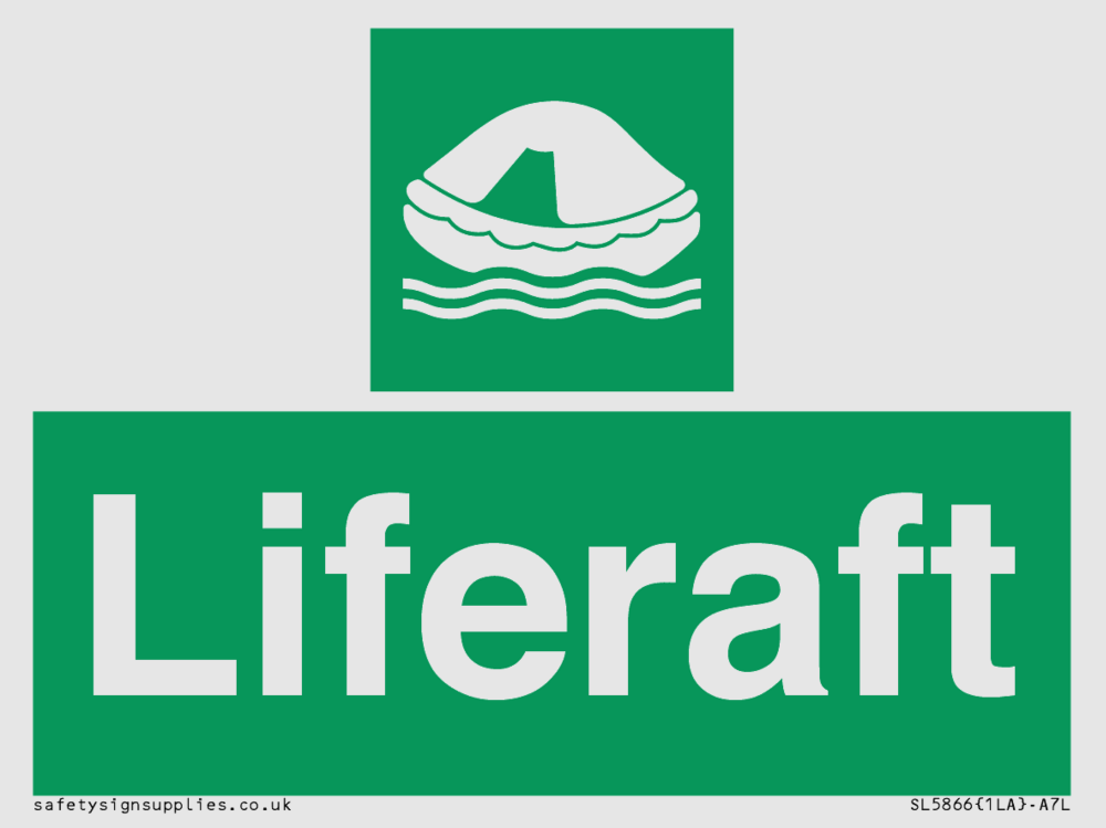 Sign Text: Liferaft Dimensions: 100x75mm Material: White Reflective Aluminium Composite 3mm Orientation: Landscape Text Colour: White Background Colour: Green More...