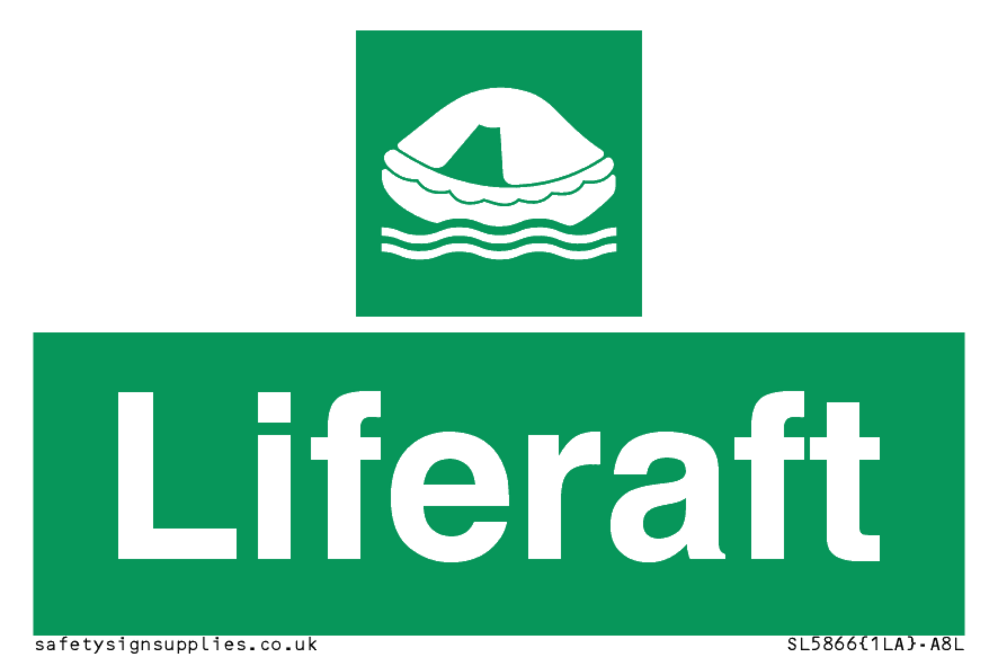 Sign Text: Liferaft Dimensions: 75x50mm Material: Aluminium Composite 3mm Orientation: Landscape Text Colour: White Background Colour: Green More...