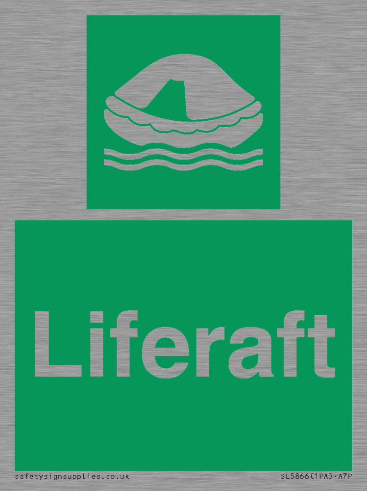 Sign Text: Liferaft Dimensions: 75x100mm Material: Stainless Steel Orientation: Portrait Text Colour: White Background Colour: Green More...