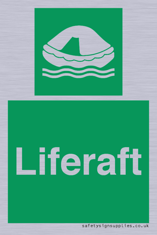 Sign Text: Liferaft Dimensions: 50x75mm Material: Grained Silver Aluminium Orientation: Portrait Text Colour: White Background Colour: Green More...