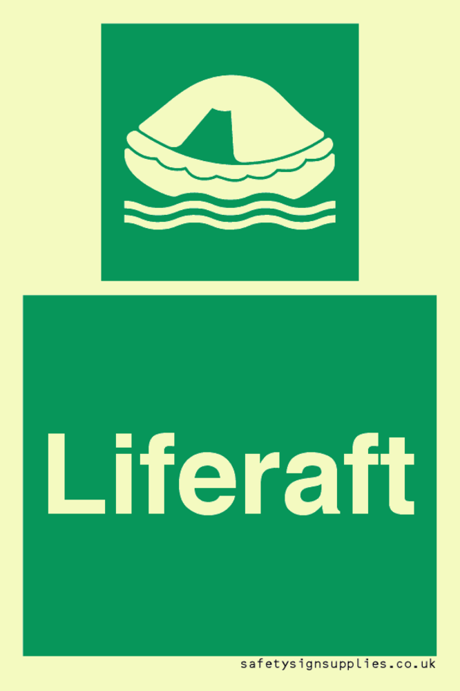 Sign Text: Liferaft Dimensions: 50x75mm Material: Plastic Semi-rigid Photoluminescent Orientation: Portrait Text Colour: White Background Colour: Green More...