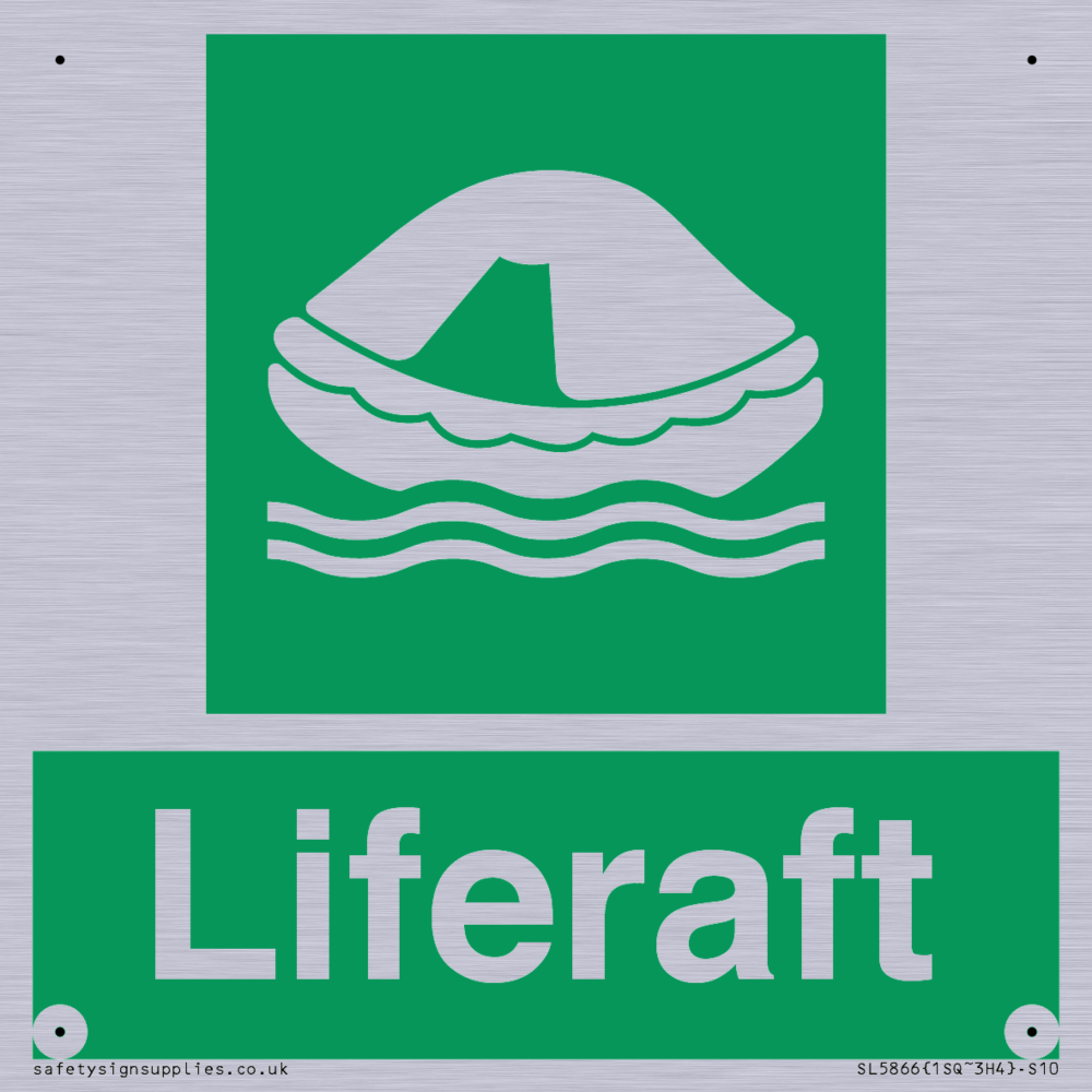 Sign Text: Liferaft Dimensions: 100x100mm Material: Grained Silver Aluminium Orientation: Square Text Colour: White Background Colour: Green More...
