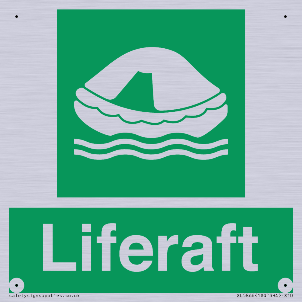Sign Text: Liferaft Dimensions: 100x100mm Material: Plastic Semi-rigid Silver Orientation: Square Text Colour: White Background Colour: Green More...