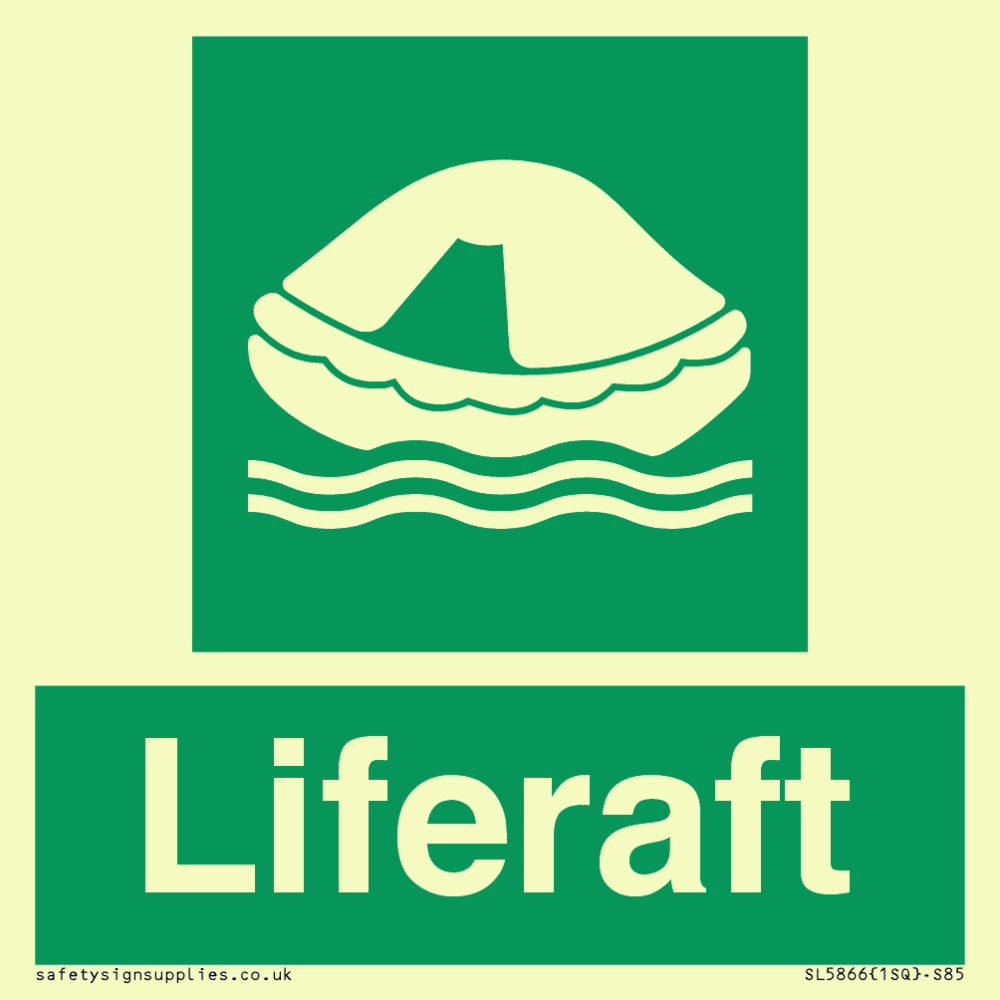 Sign Text: Liferaft Dimensions: 85x85mm Material: Plastic Semi-rigid Photoluminescent Orientation: Square Text Colour: White Background Colour: Green More...