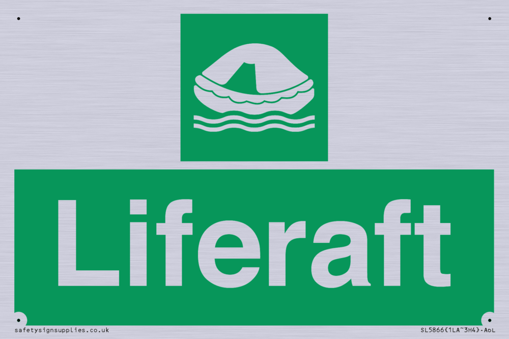 Sign Text: Liferaft Dimensions: 150x100mm Material: Plastic Semi-rigid Silver Orientation: Landscape Text Colour: White Background Colour: Green More...