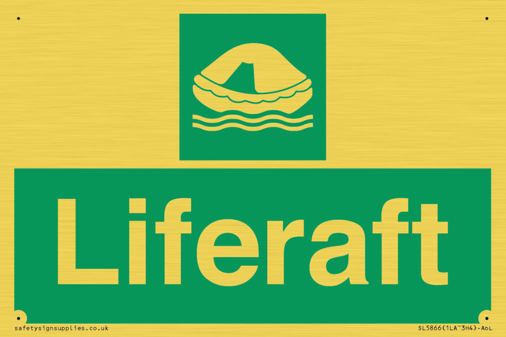 Sign Text: Liferaft Dimensions: 150x100mm Material: Plastic Semi-rigid Gold Orientation: Landscape Text Colour: White Background Colour: Green More...