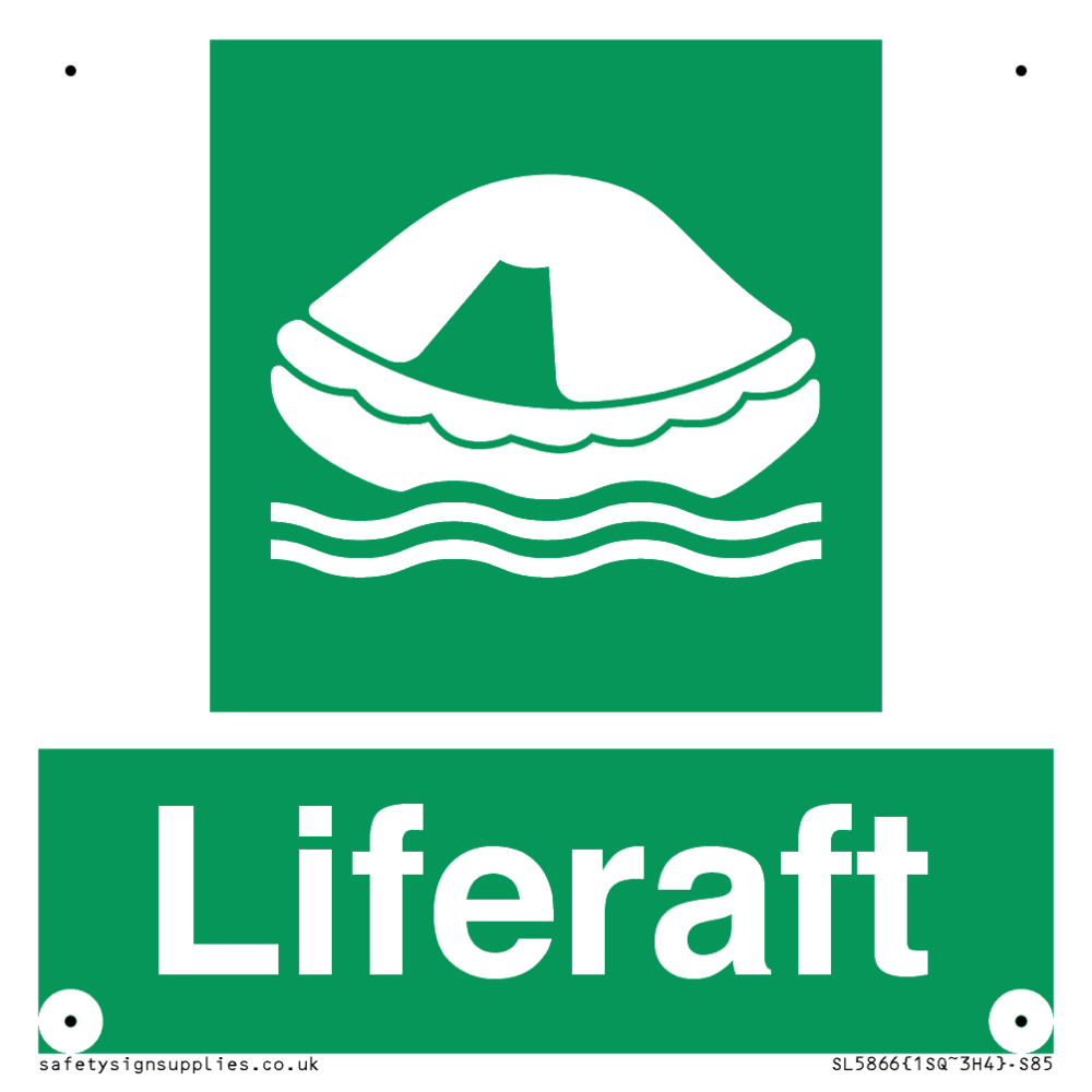 Sign Text: Liferaft Dimensions: 85x85mm Material: Aluminium Composite 3mm Orientation: Square Text Colour: White Background Colour: Green More...