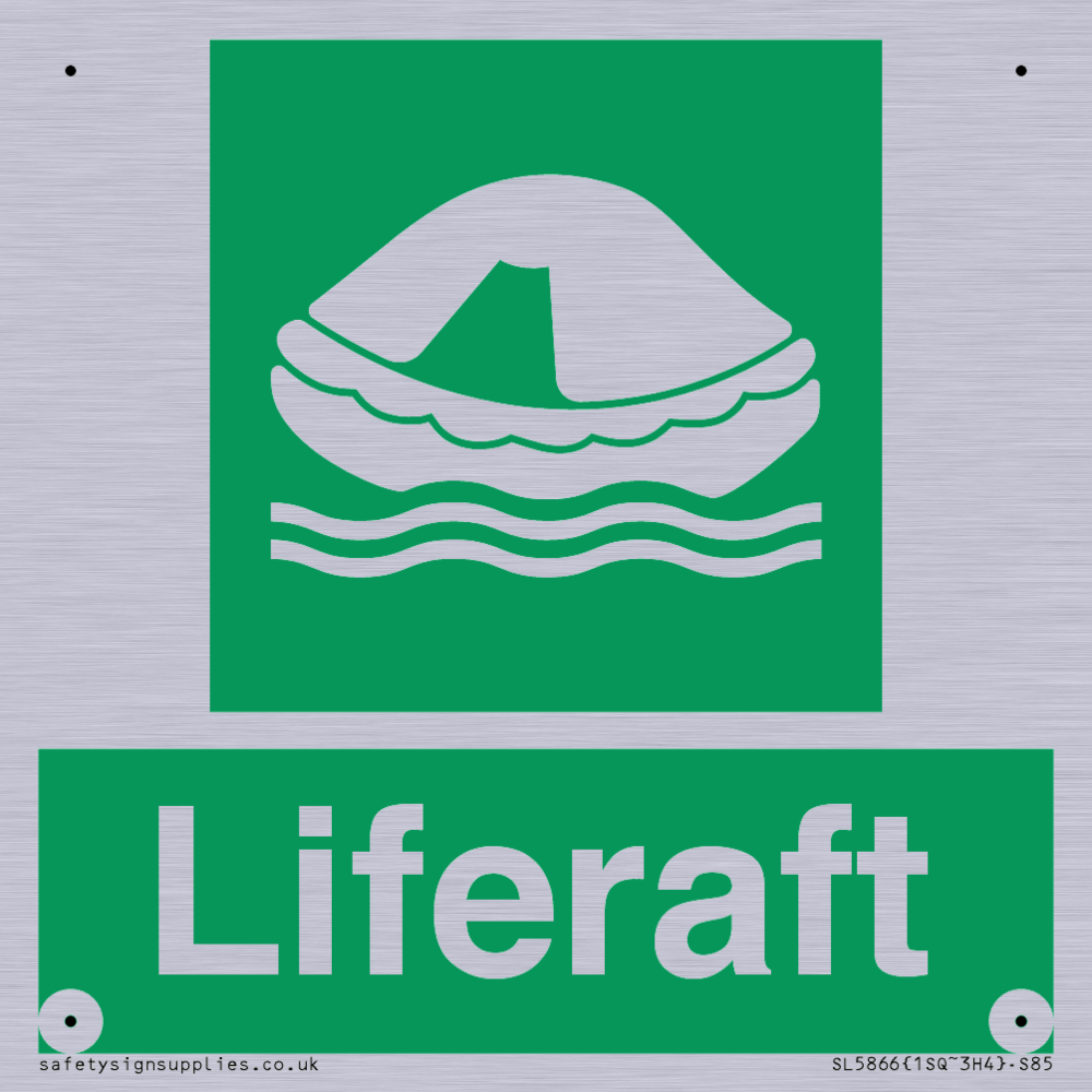 Sign Text: Liferaft Dimensions: 85x85mm Material: Grained Silver Aluminium Orientation: Square Text Colour: White Background Colour: Green More...