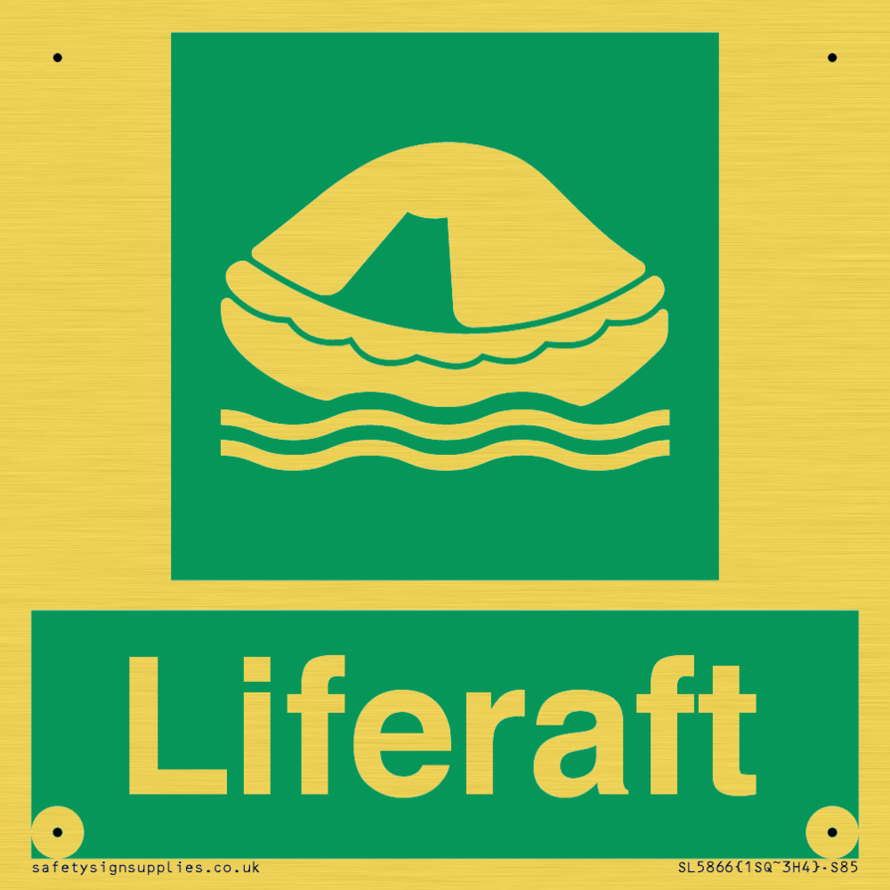 Sign Text: Liferaft Dimensions: 85x85mm Material: Plastic Semi-rigid Gold Orientation: Square Text Colour: White Background Colour: Green More...