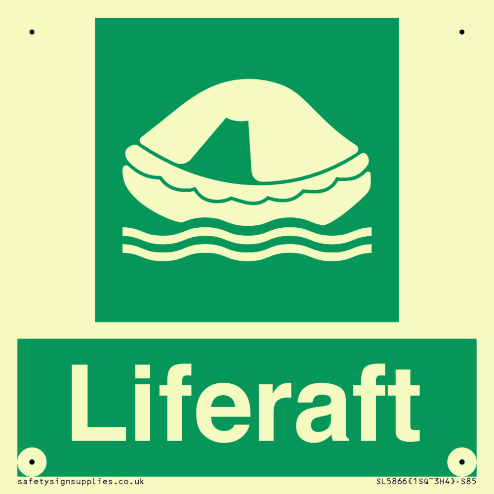 Sign Text: Liferaft Dimensions: 85x85mm Material: Plastic Semi-rigid Photoluminescent Orientation: Square Text Colour: White Background Colour: Green More...