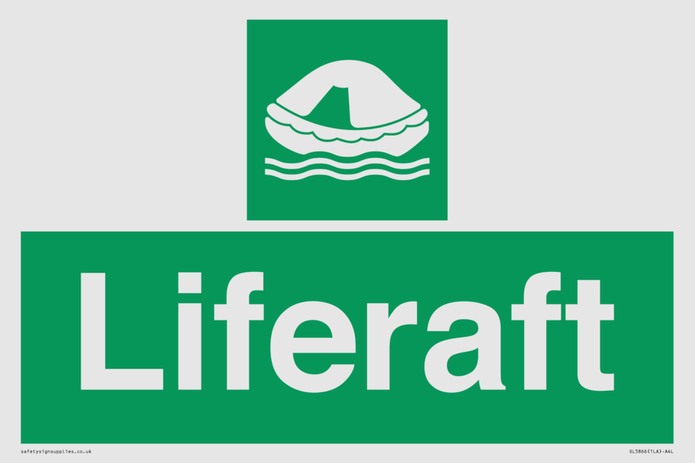 Sign Text: Liferaft Dimensions: 300x200mm Material: White Reflective Aluminium Composite 3mm Orientation: Landscape Text Colour: White Background Colour: Green More...