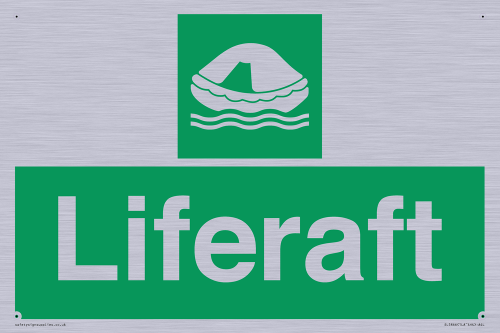 Sign Text: Liferaft Dimensions: 300x200mm Material: Grained Silver Aluminium Orientation: Landscape Text Colour: White Background Colour: Green More...