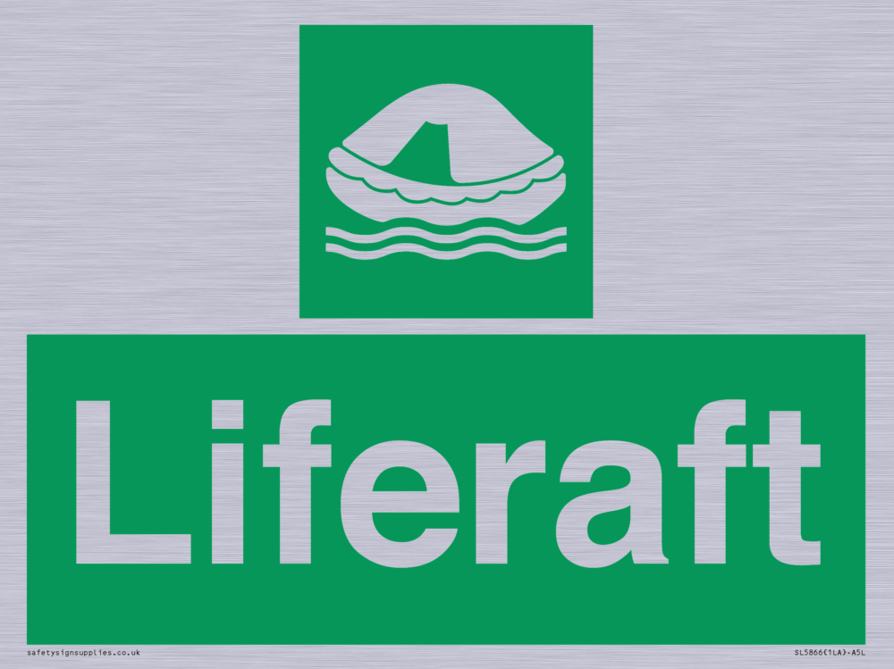 Sign Text: Liferaft Dimensions: 200x150mm Material: Grained Silver Aluminium Orientation: Landscape Text Colour: White Background Colour: Green More...