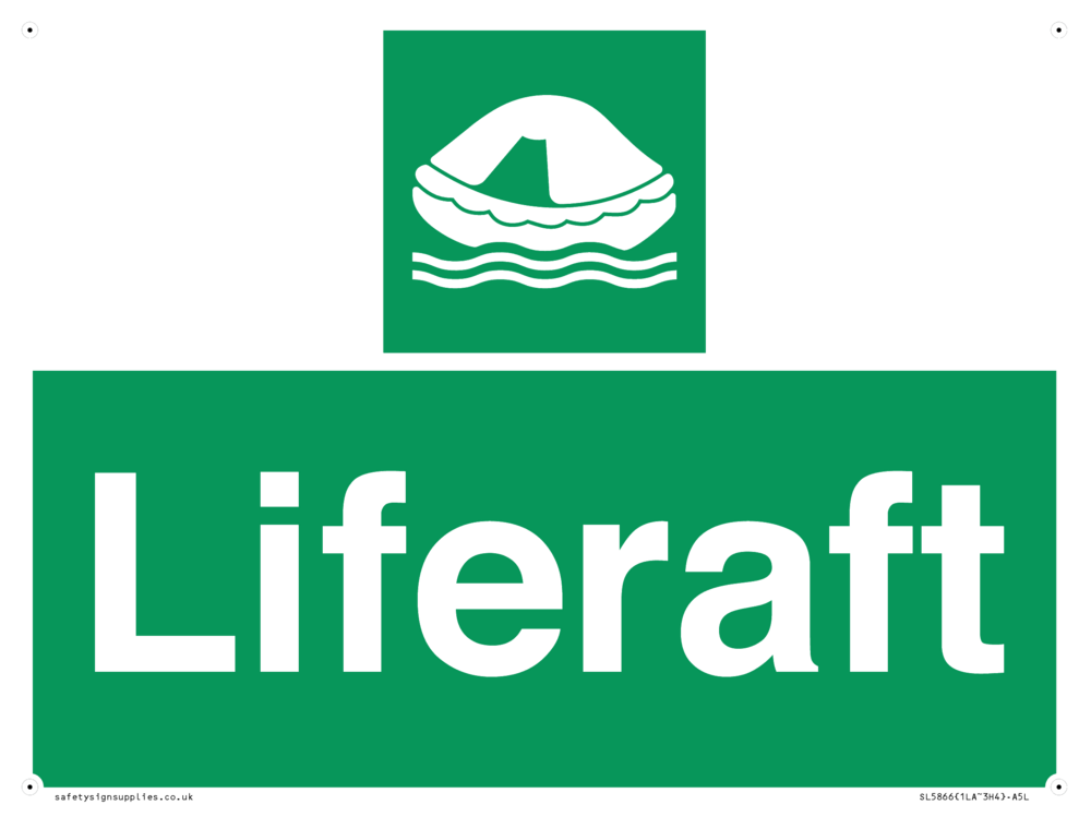 Sign Text: Liferaft Dimensions: 200x150mm Material: Aluminium composite 3mm with lamination Orientation: Landscape Text Colour: White Background Colour: Green More...
