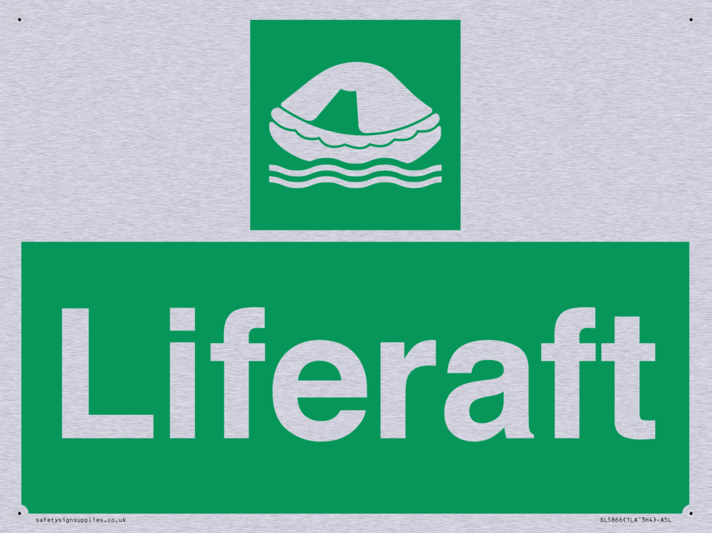 Sign Text: Liferaft Dimensions: 200x150mm Material: Satin Silver Aluminium Orientation: Landscape Text Colour: White Background Colour: Green More...