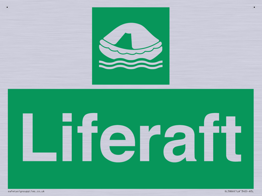 Sign Text: Liferaft Dimensions: 200x150mm Material: Plastic Semi-rigid Silver Orientation: Landscape Text Colour: White Background Colour: Green More...