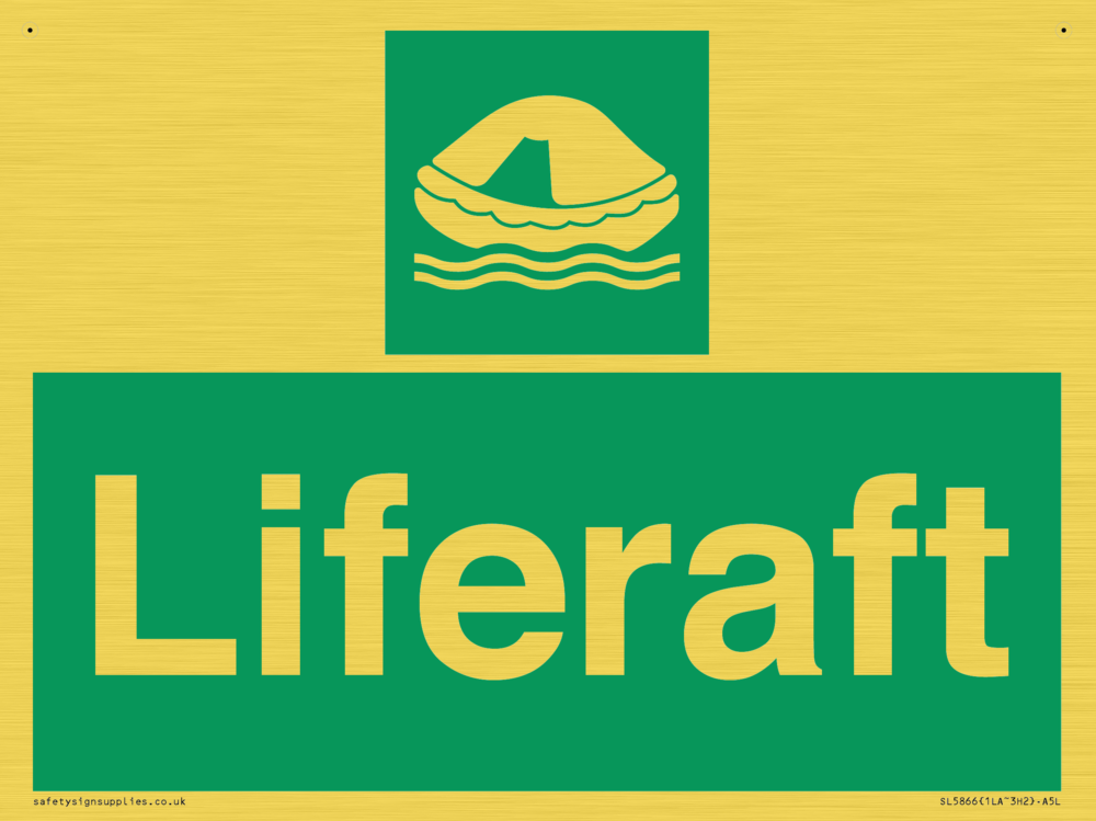 Sign Text: Liferaft Dimensions: 200x150mm Material: Plastic Semi-rigid Gold Orientation: Landscape Text Colour: White Background Colour: Green More...
