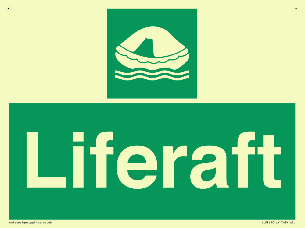 Sign Text: Liferaft Dimensions: 200x150mm Material: Plastic Semi-rigid Photoluminescent Orientation: Landscape Text Colour: White Background Colour: Green More...