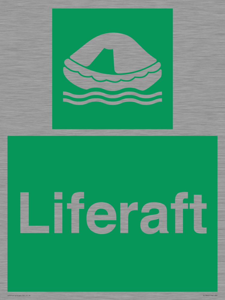 Sign Text: Liferaft Dimensions: 300x400mm Material: Stainless Steel Orientation: Portrait Text Colour: White Background Colour: Green More...