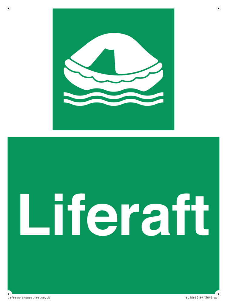 Sign Text: Liferaft Dimensions: 150x200mm Material: Plastic Semi-rigid 1mm Orientation: Portrait Text Colour: White Background Colour: Green More...