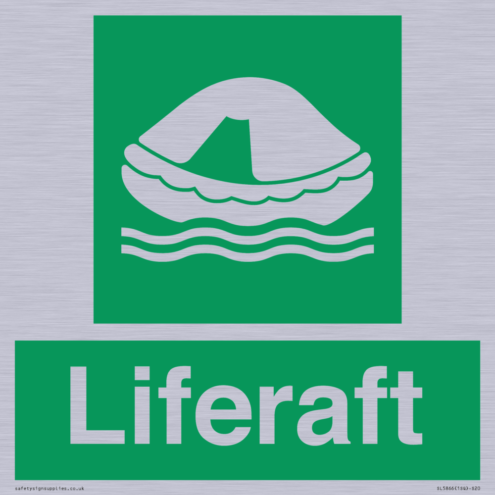 Sign Text: Liferaft Dimensions: 200x200mm Material: Grained Silver Aluminium Orientation: Square Text Colour: White Background Colour: Green More...