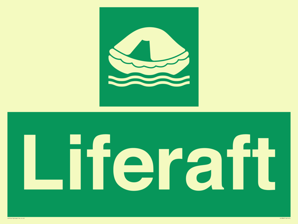 Sign Text: Liferaft Dimensions: 800x600mm Material: Plastic Semi-rigid Photoluminescent Orientation: Landscape Text Colour: White Background Colour: Green More...