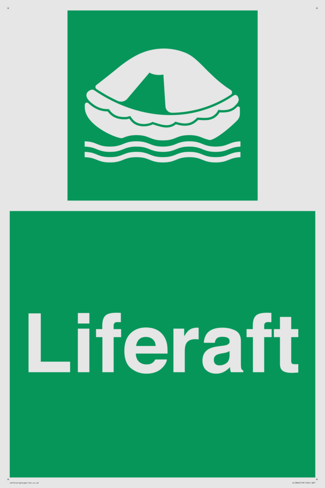 Sign Text: Liferaft Dimensions: 400x600mm Material: White Reflective Aluminium Composite 3mm Orientation: Portrait Text Colour: White Background Colour: Green More...