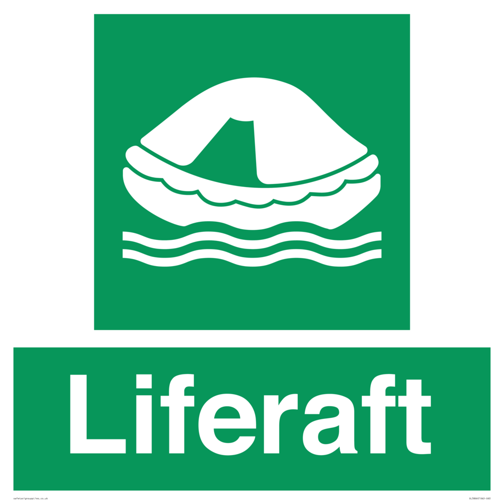 Sign Text: Liferaft Dimensions: 600x600mm Material: Vinyl / Sticker Orientation: Square Text Colour: White Background Colour: Green More...