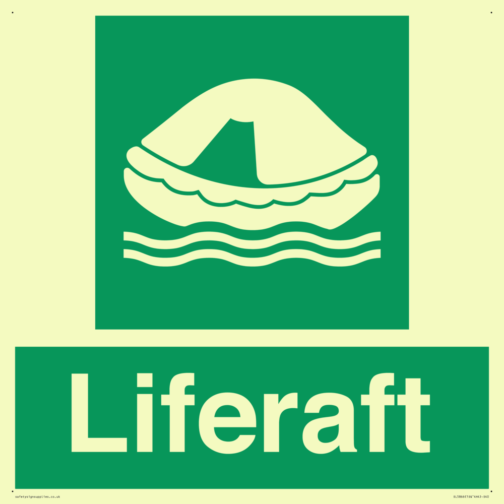 Sign Text: Liferaft Dimensions: 400x400mm Material: Plastic Semi-rigid Photoluminescent Orientation: Square Text Colour: White Background Colour: Green More...