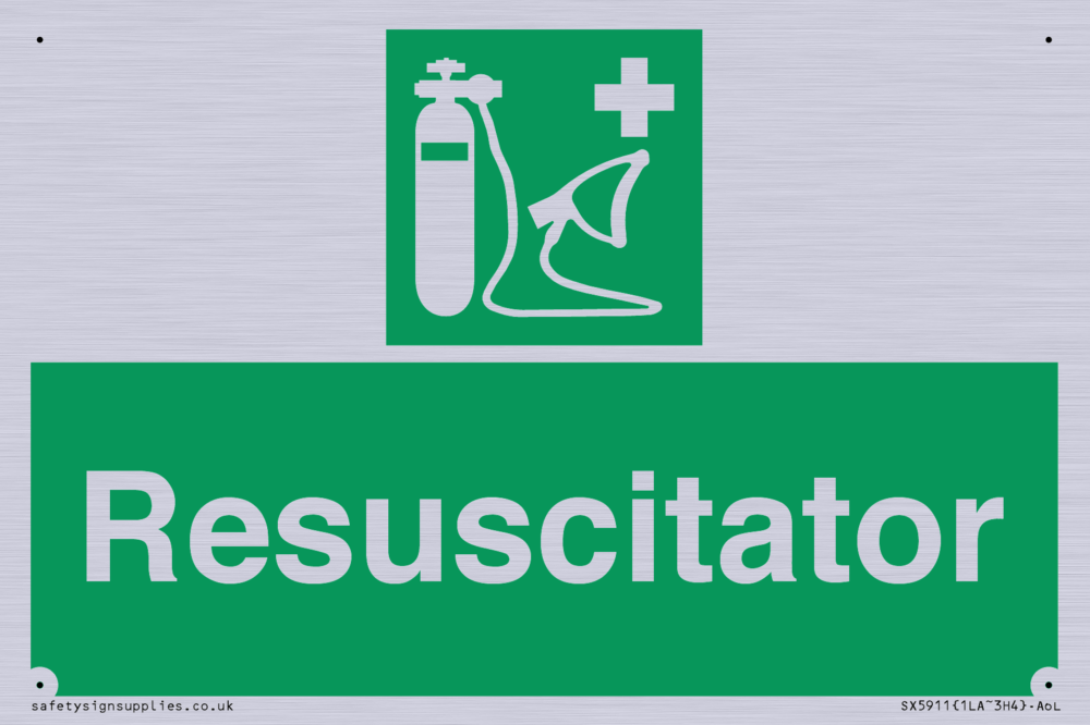Sign Text: Resuscitator Dimensions: 150x100mm Material: Plastic Semi-rigid Silver Orientation: Landscape Text Colour: White Background Colour: Green More...