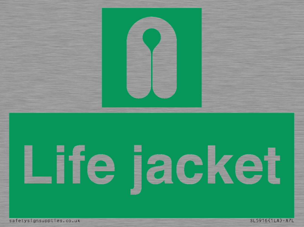 Sign Text: Life jacket Dimensions: 100x75mm Material: Stainless Steel Orientation: Landscape Text Colour: White Background Colour: Green More...