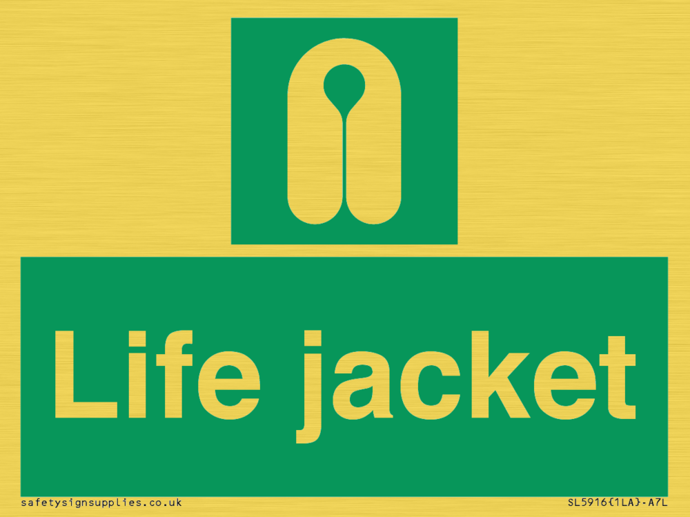 Sign Text: Life jacket Dimensions: 100x75mm Material: Plastic Semi-rigid Gold Orientation: Landscape Text Colour: White Background Colour: Green More...