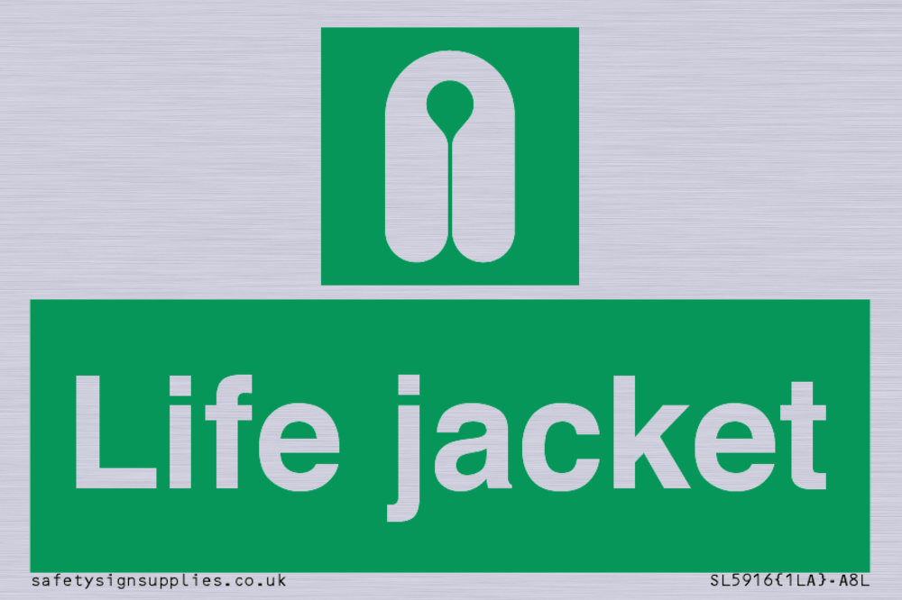 Sign Text: Life jacket Dimensions: 75x50mm Material: Vinyl Silver sticker Orientation: Landscape Text Colour: White Background Colour: Green More...