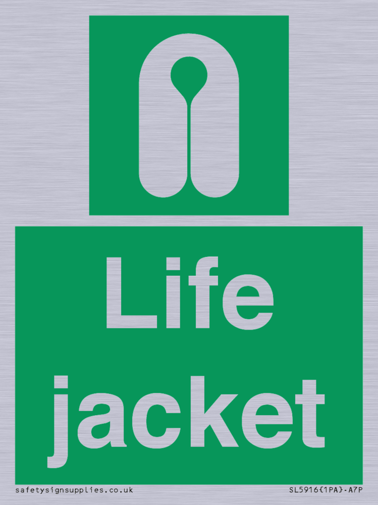Sign Text: Life jacket Dimensions: 75x100mm Material: Grained Silver Aluminium Orientation: Portrait Text Colour: White Background Colour: Green More...