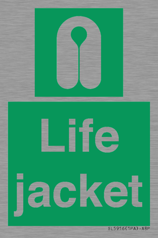 Sign Text: Life jacket Dimensions: 50x75mm Material: Stainless Steel Orientation: Portrait Text Colour: White Background Colour: Green More...