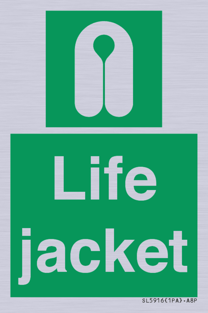 Sign Text: Life jacket Dimensions: 50x75mm Material: Vinyl Silver sticker Orientation: Portrait Text Colour: White Background Colour: Green More...