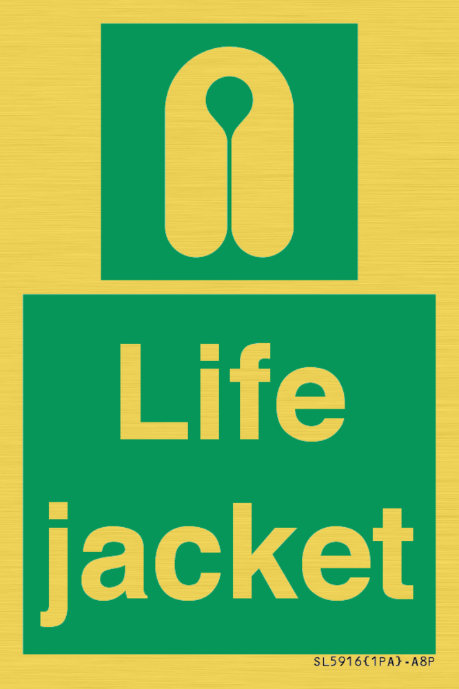 Sign Text: Life jacket Dimensions: 50x75mm Material: Vinyl Gold sticker Orientation: Portrait Text Colour: White Background Colour: Green More...